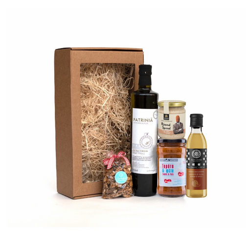 Produktų rinkinys su tikrais graikiškais skoniais. Tai puiki dovana šeimai, nes produktai atrinkti pagal visų skonį: aliejus - virtuvės ekspertui ar sveikuoliui, pomidorų padažas su feta - gurmaniškiems užkandžiams, šokoladinis pistacijų kremas - smaližiui, o balzaminis kremas - šeimos salotoms ar vaisiams pagardinti.